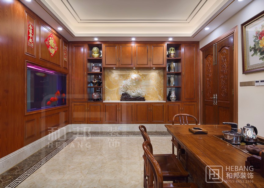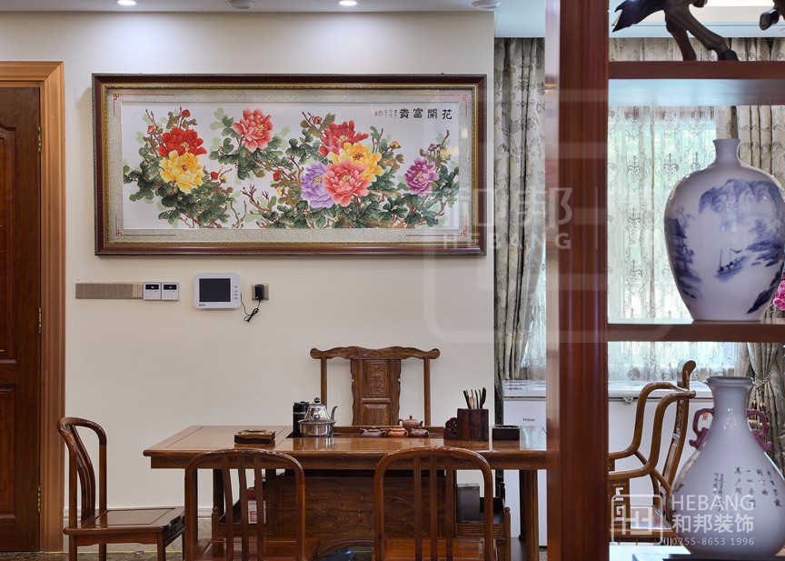 空間內大量運用的木飾面、藤條、石材等天然裝飾材料,以及配合使用的棉麻質地等極具自然情趣的家具在設計師的巧妙運用下打造出了一個靜謐雅致,深富中式的家居空間。