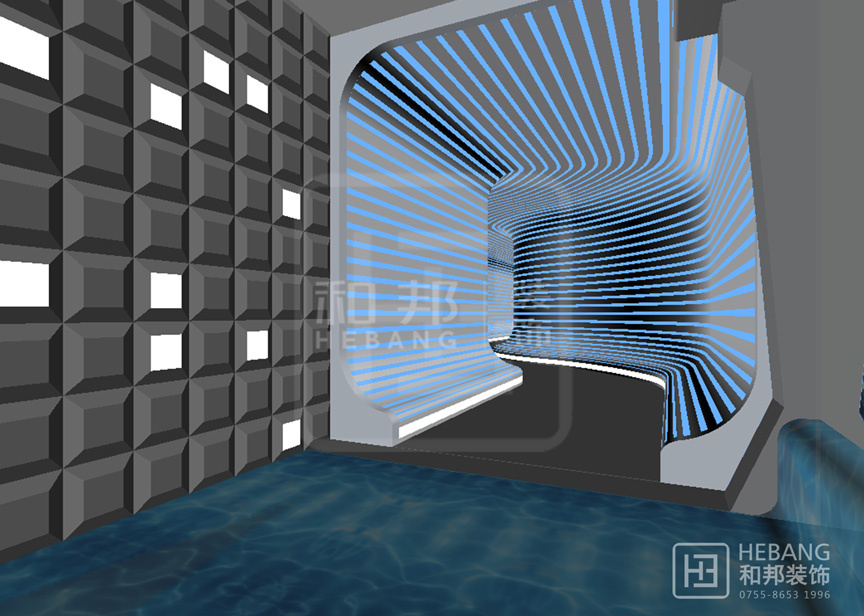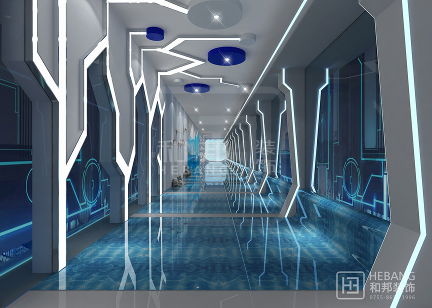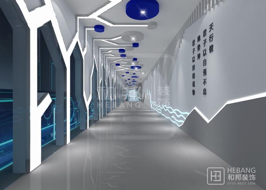 | 設(shè)計(jì)說(shuō)明 | 藍(lán)色貫穿于整個(gè)設(shè)計(jì)前后,讓人感覺干凈整潔。墻壁飾有的古代名言警句以及極富現(xiàn)代科技感的線條,行走在其中,像是穿越了古今,讓人流連往返。 | ||||