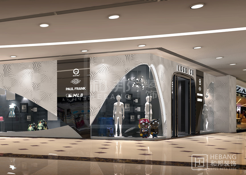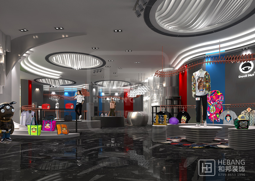 極具現代風格,豐富的色彩運用以及富有童趣的設計元素使整個賣場氛圍輕松、明快。創意十足的天花設計以及吸引眼球的墻面裝飾更能吸引消費者眼球。